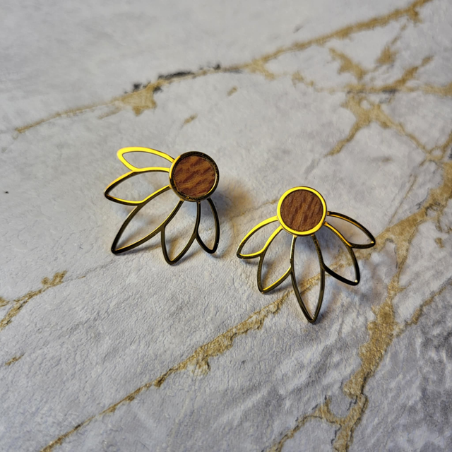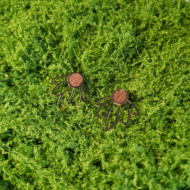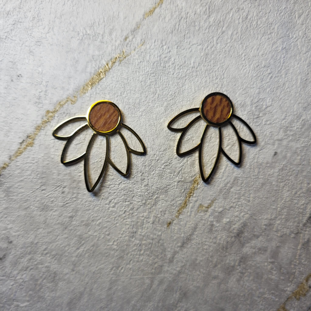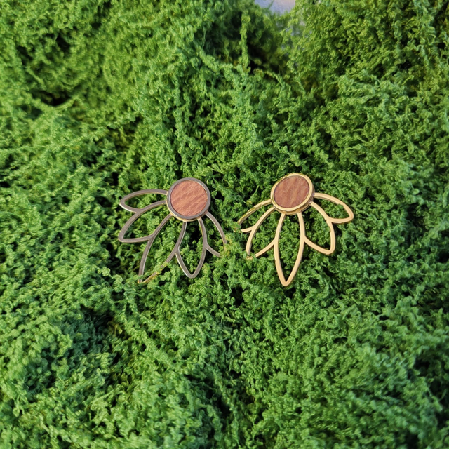 Les Puces Racine Évanéa évoquent la délicatesse d’une fleur suspendue dans le temps. Montées sur un support en acier inoxydable doré, elles accueillent une incrustation en platane maillé, dont les nuances naturelles apportent douceur et singularité à chaque pièce.