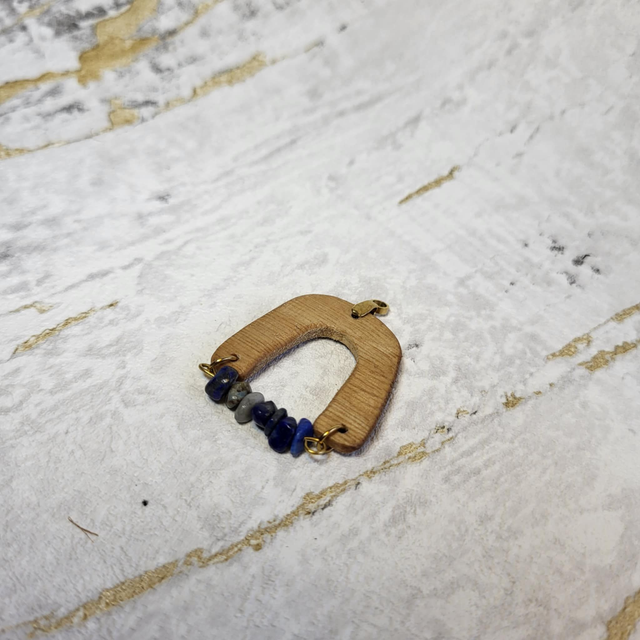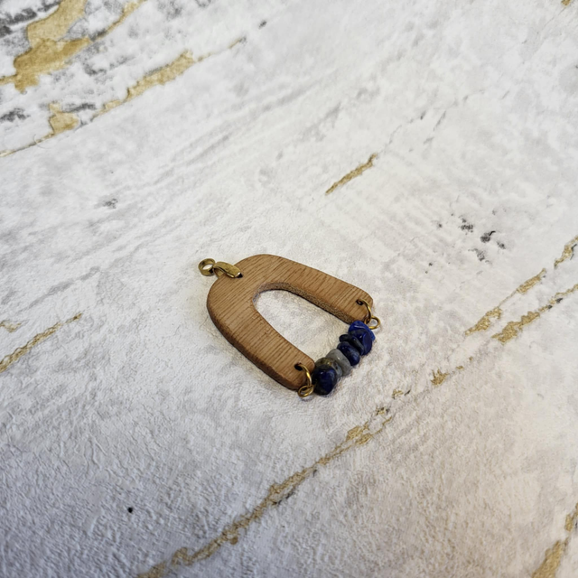 Le Pendentif Luperis mêle élégance graphique et chaleur naturelle. Sa forme en U inversé, réalisée en châtaignier, est fermée par une tige centrale en acier inoxydable 304 doré, sertie de fines pierres de lapis lazuli qui captent la lumière avec subtilité.