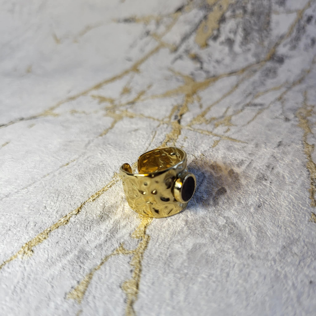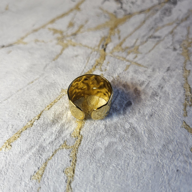 La Bague Ombrelle exprime la force et la matière dans un design affirmé et contemporain. Façonnée en acier inoxydable 316 martelé, sa surface texturée capte la lumière et apporte relief et caractère.