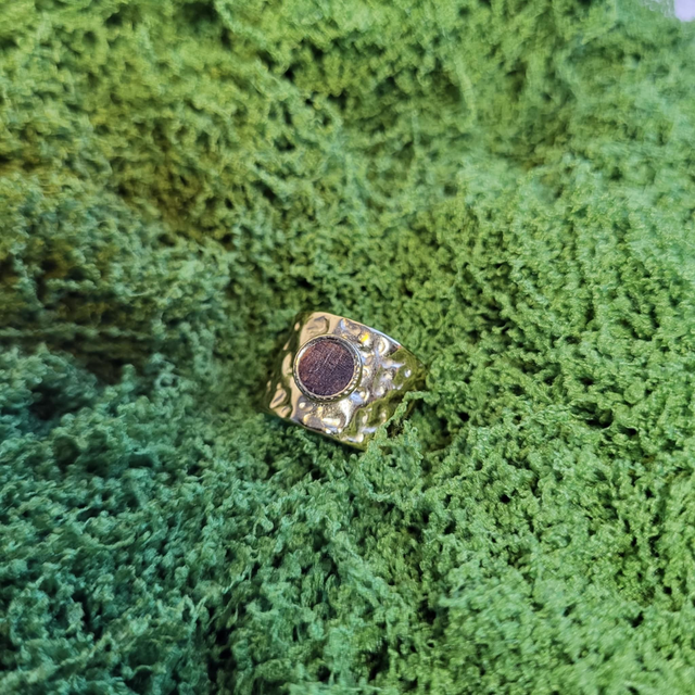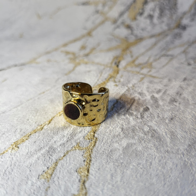 Ajustable, la bague s’adapte à toutes les mains tout en offrant une présence visible et unique. Chaque incrustation révèle les nuances subtiles du bois recyclé, faisant de chaque pièce un bijou singulier et vivant.