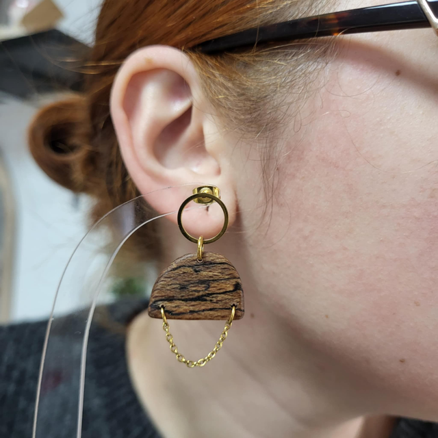 De ce demi-cercle pend une chaîne délicate, attachée à chaque extrémité, créant un effet aérien et fluide qui épouse subtilement le lobe. L’équilibre entre métal doré et bois naturel donne à ces puces élégantes une allure contemporaine et organique.