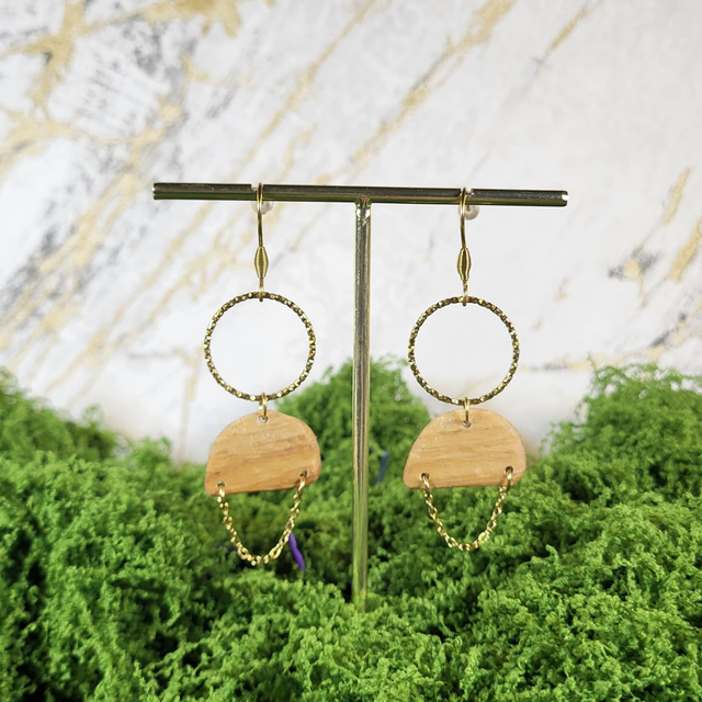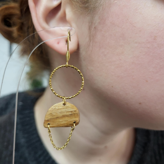 Les Boucles Racine Pendrel jouent avec la légèreté et l’équilibre des formes. Suspendu à un crochet en acier, un anneau ciselé capte la lumière et révèle toute la finesse du métal. De cet ensemble pend un demi-cercle en châtaignier, aux teintes chaleureuses et au veinage naturel unique.