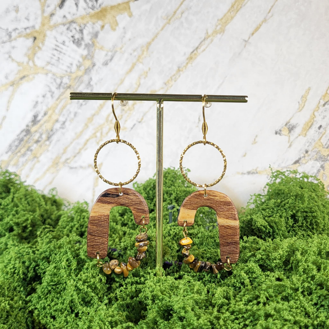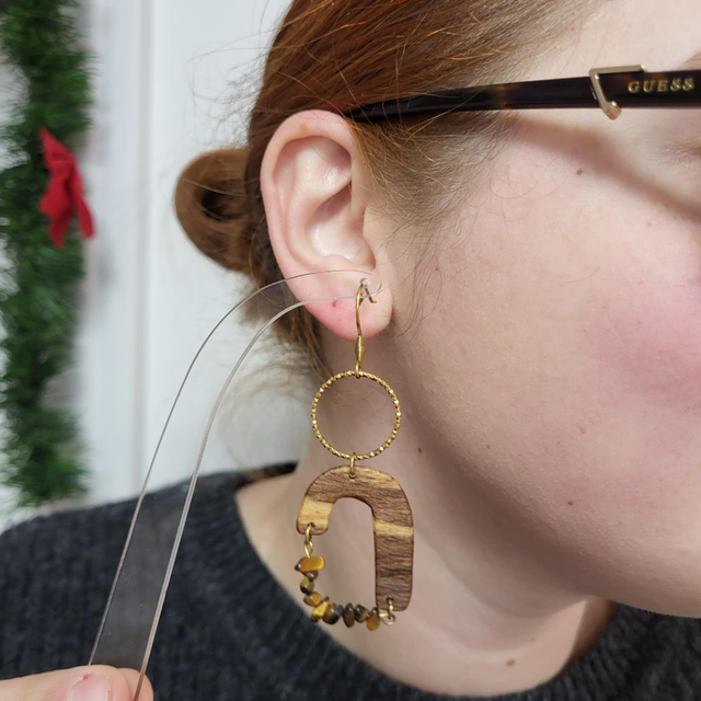 L’ensemble crée un bijou léger, graphique et aérien, qui se déploie élégamment autour du lobe. Les nuances naturelles du bois et les reflets dorés des pierres rendent chaque pièce unique et captivante.